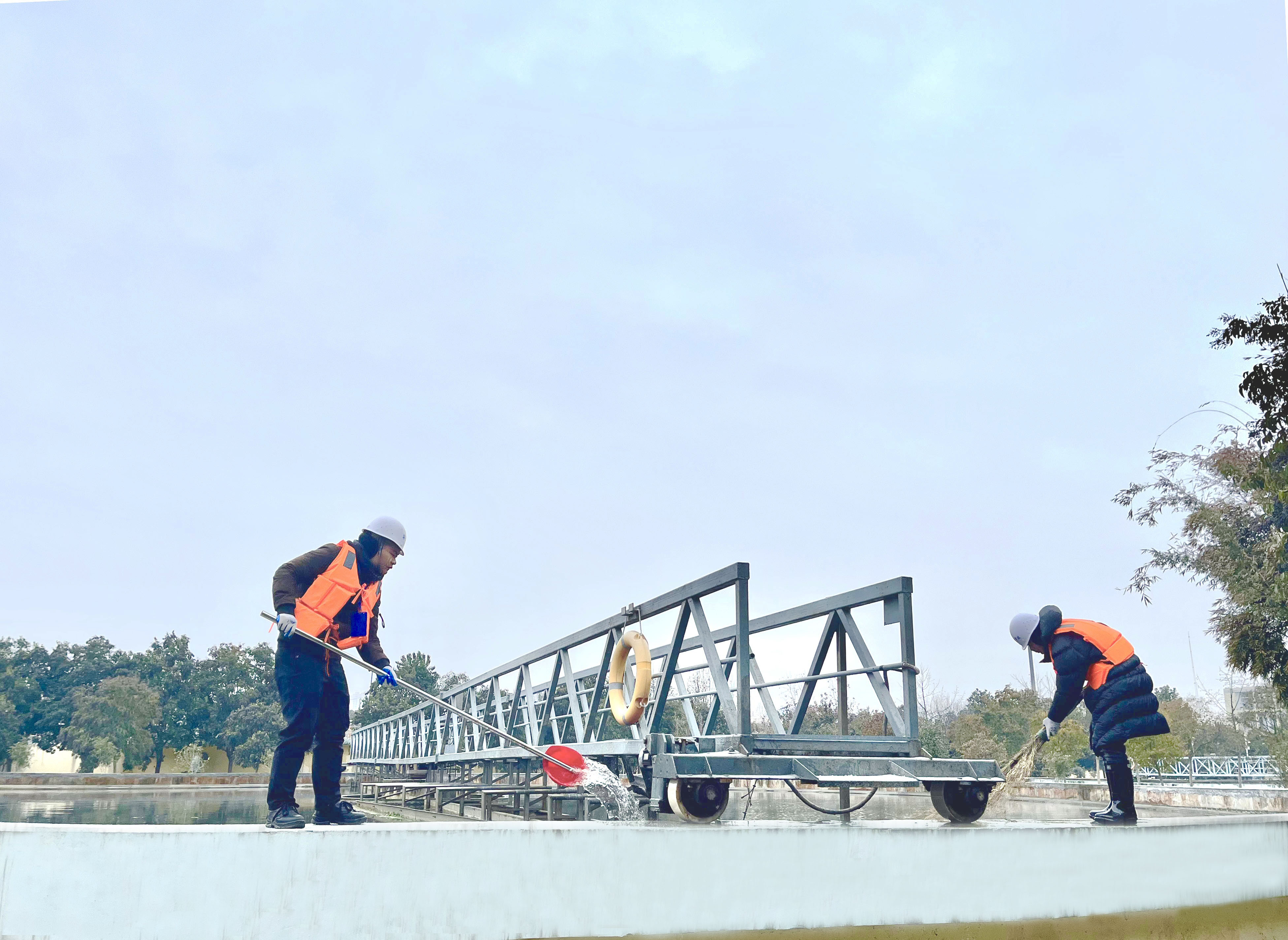 為了讓二沉池盡快運轉(zhuǎn),在等待水泵安裝的過程中,朱總和葉廠長冒著寒風(fēng)雨雪帶領(lǐng)生產(chǎn)部和機電部的同事,人工清理軌道上的凍雪。大家穿上救生衣,戴上安全帽和防護手套等用品,準(zhǔn)備了多種工具,嘗試著幾種討論的方案。先用鐵鍬鏟鑿冰面,卻發(fā)現(xiàn)冰層又堅硬又滑鏟不動。又換成水瓢舀水用鐵鍬鏟,發(fā)現(xiàn)效率不高且積水過多容易結(jié)冰。經(jīng)過反復(fù)嘗試嘗試驗,最終選用兩人分工合作,前面的人用水瓢舀水,后面的人用快速把掃的方式。大家兩兩一組分布在四個池子清掃。不知不覺中寒風(fēng)將被濺的水珠和雨雪吹成了一顆顆冰粒,落在大家身上。眾人顧不得修整,一圈接著一圈的打掃著,最終機器成功繼續(xù)運轉(zhuǎn)起來。同時水泵也安裝完成,打開電源后,正如大家預(yù)想的那樣,前方水管不斷沖刷融化冰面,后面轉(zhuǎn)動的輪子就不會打滑。隨著四個水泵的接入,四個二沉池全部正常運轉(zhuǎn)起來。