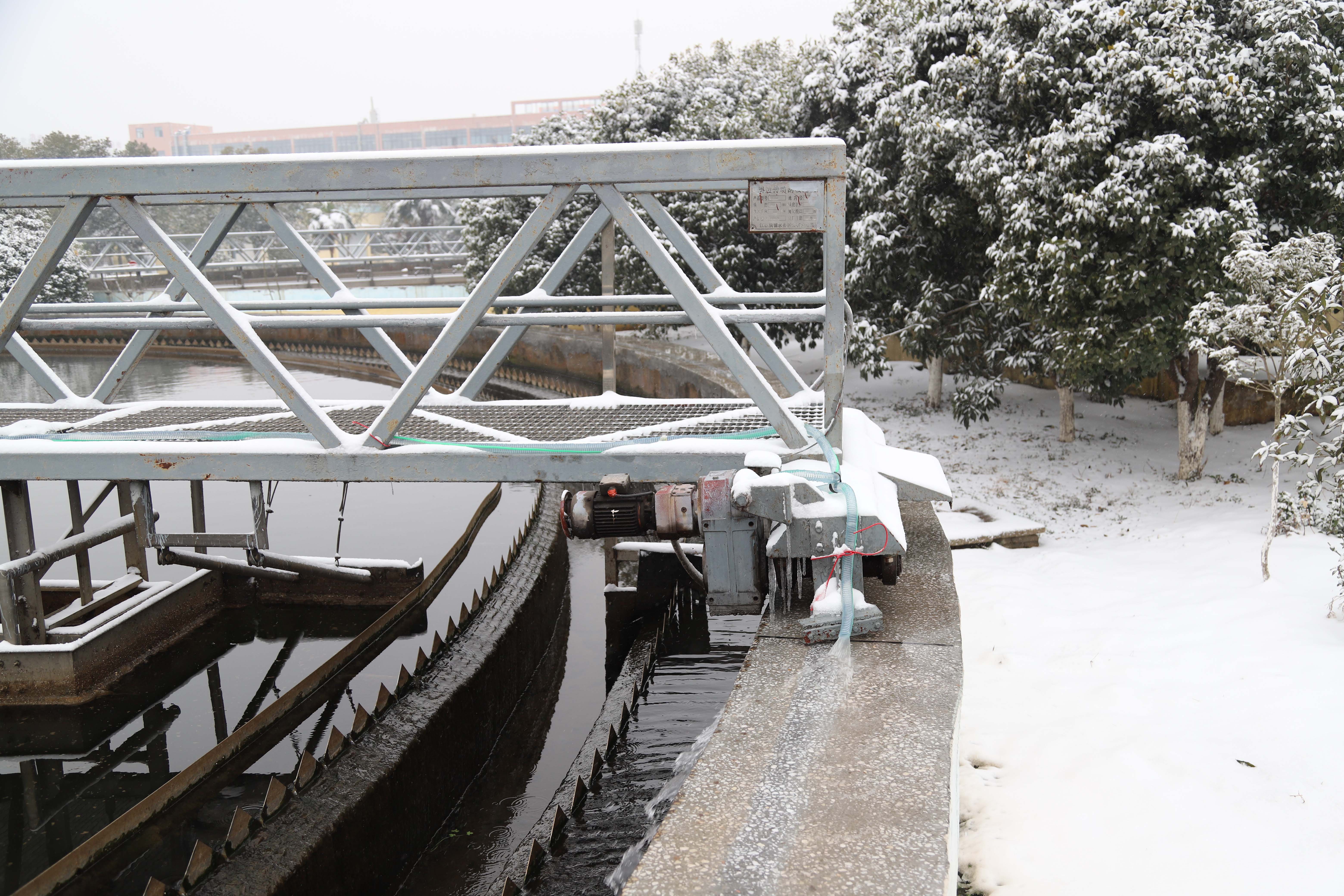 污水處理工作不僅關(guān)系著生態(tài)環(huán)境,也是關(guān)系著千家萬戶的民生大事,寒潮天氣下,隨州公司生產(chǎn)人員冒著風(fēng)雪進行重點地巡檢,通過巡檢觀察污水處理廠各工藝單元的感官現(xiàn)象和指標(biāo),初步判斷水質(zhì)的變化和運行是否正常、穩(wěn)定,重點設(shè)備是否正常運行。在巡檢的過程中,生產(chǎn)人員發(fā)現(xiàn)一期四座二沉池下方輪子出現(xiàn)打滑空轉(zhuǎn),二沉池運轉(zhuǎn)停止的情況。雪落在行走軌道上,被行走輪壓實后,形成雪層,造成行走輪的打滑,使刮泥機長時間在一個位置運行,池底的污泥無法全部排出,造成工藝運行的異常,需要及時清理干凈軌道表面的冰層。發(fā)現(xiàn)問題后,生產(chǎn)各部門緊急召開臨時會議,制定解決方案,最終決定安裝水泵,從池子抽水澆注在軌上道,保障軌道正常運行。
