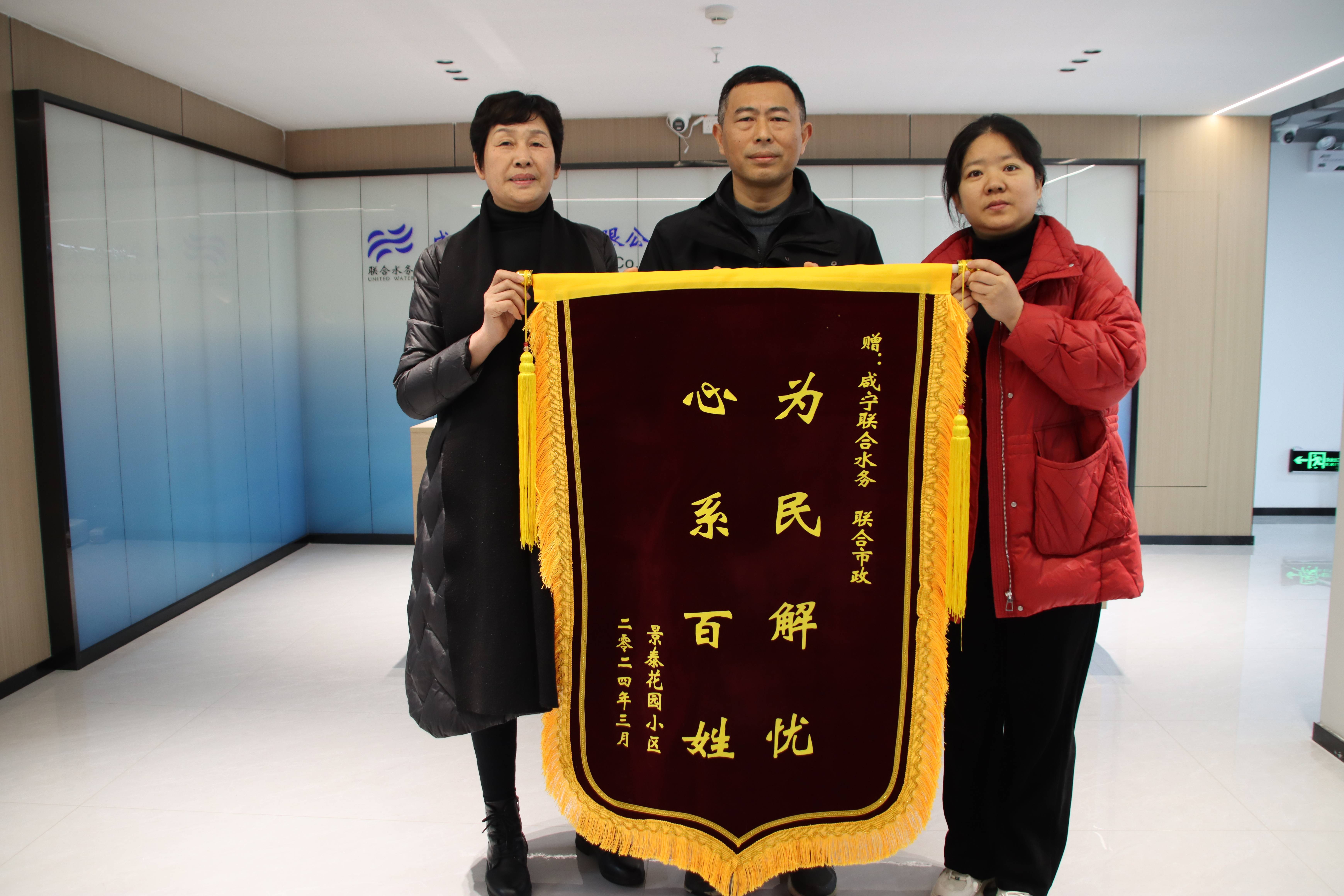 3月18日上午,湖北省咸安區(qū)景泰花園小區(qū)物業(yè)代表楊女士及業(yè)主代表專程將一面印著“為民解憂、心系百姓”的錦旗送到聯(lián)合水務集團運營管理中心管網總監(jiān)兼咸寧區(qū)域管網副總經理夏維龍手中,對咸寧聯(lián)合水務有限公司、咸寧聯(lián)合市政工程有限公司積極上門服務、熱情解決居民實際用水問題表示感謝。