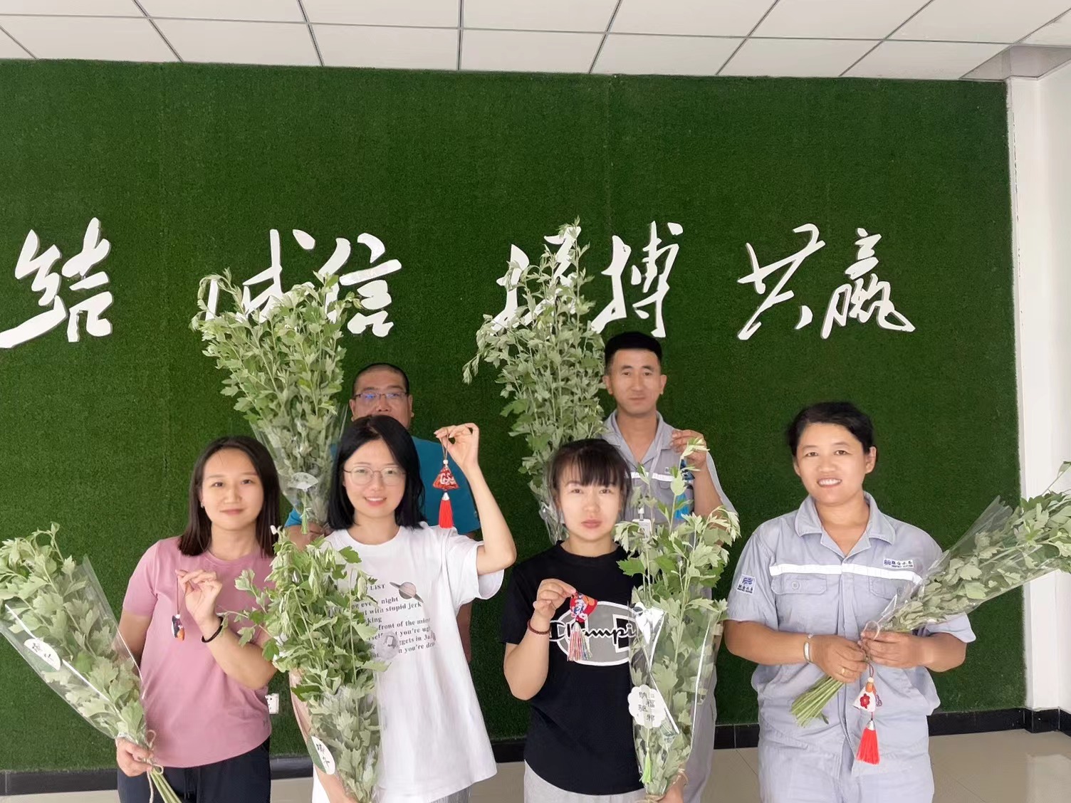 艾草花束 沒有一個節(jié)日的儀式感是一束花所給不了的,端午節(jié)也不例外。此次活動大家就地取材,公司員工提前挖出園里的新鮮艾草、用剪刀修剪艾草的長度和形狀,制造層次感。并將包裝紙裹在艾草根部,用麻繩固定。在花束上綁上各式的小卡片或小裝飾品。一束束飽含吉祥象征的端午花束就做好了。制作現(xiàn)場大家互幫互助互敬互贈,彼此將美好的祝福及心意連同花束一同贈予。倒掛的艾草花束,傳遞出的是納福驅(qū)邪,祝福安康的美好寓意,也是團(tuán)隊協(xié)作之美的彰顯。