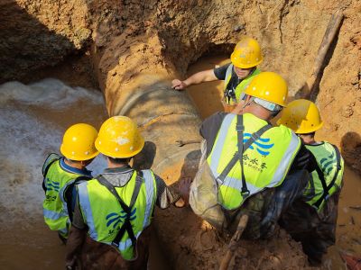 不懼“烤”驗(yàn),隨時(shí)出擊。7月5日,永安大道DN600主管道突發(fā)爆管,咸寧思源水務(wù)接到報(bào)修電話,立即組織人員趕赴現(xiàn)場(chǎng),爭(zhēng)分奪秒開展管網(wǎng)搶修作業(yè)。搶修人員第一時(shí)間設(shè)置安全警示標(biāo)識(shí),在確定好漏點(diǎn)位置、做好現(xiàn)場(chǎng)保護(hù)、關(guān)閥停水后,頂著36℃高溫,有條不紊展開搶修工作。經(jīng)過抽水、挖掘、清理,管道破損位置露出水面。在狹長窄小的管溝中作業(yè),轉(zhuǎn)身接零部件都得小心翼翼,搶修人員身上的衣服濕了干、干了濕,似火的烈日曬得他們皮膚滾燙,藿香正氣水的刺鼻味道充斥在他們的胸腔,有人笑稱:“藿香正氣水都喝飽了!蹦呐略谶@樣的工作環(huán)境下,他們也沒有一個(gè)人抱怨,沒有一個(gè)人偷懶,用八多個(gè)小時(shí)的堅(jiān)守?fù)Q來了居民在炎炎夏日里的用水安全。