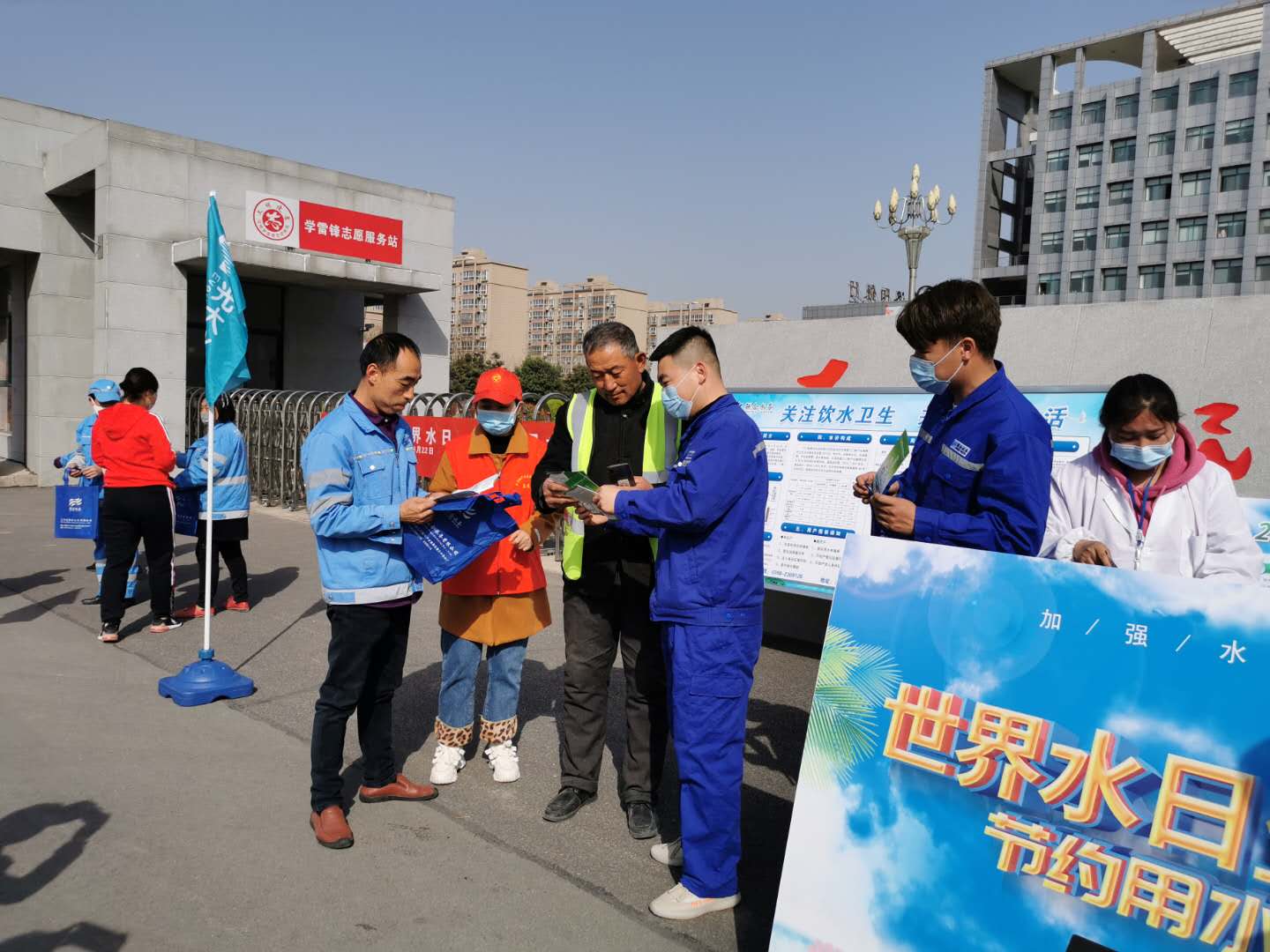 圖1:給小區(qū)住戶講解生活用水小常識(shí) 活動(dòng)地點(diǎn)設(shè)在示范區(qū)管委會(huì)門口,隨著近期疫情逐步平息,各個(gè)企業(yè)復(fù)工復(fù)產(chǎn),當(dāng)天來政府辦事的人員絡(luò)繹不絕。為了認(rèn)真做好此次“世界水日”宣傳,三門峽聯(lián)合水務(wù)各部門精心籌劃活動(dòng)方案,仔細(xì)準(zhǔn)備宣傳資料。由管網(wǎng)客服部、人事行政部和水質(zhì)檢測(cè)中心組成的宣傳小組,在佩戴口罩做好個(gè)人防護(hù)的同時(shí),認(rèn)真為現(xiàn)場(chǎng)到來的群眾做好自來水知識(shí)講解。通過分發(fā)宣傳冊(cè)及小禮品,悉心為每一位群眾解答在自來水用水過程中的疑惑,得到了在場(chǎng)人員的一致好評(píng)。