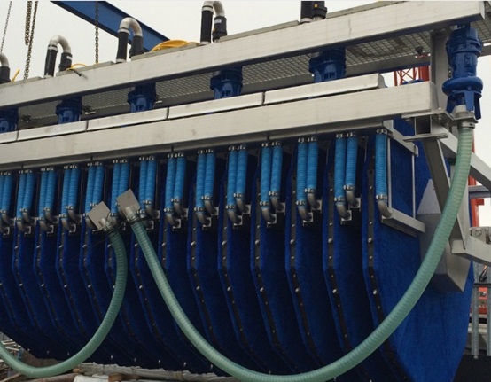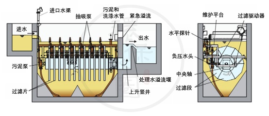 當(dāng)水流經(jīng)濾布進(jìn)入過(guò)濾段時(shí),水中的懸浮物被除去,固體留在濾布上。過(guò)濾后的水通過(guò)中央軸、上升豎井和溢流堰流出裝置。隨著固體顆粒在濾布上的堆積,過(guò)濾單元上的液壓阻力增大,從而使濾槽內(nèi)的水位升高。